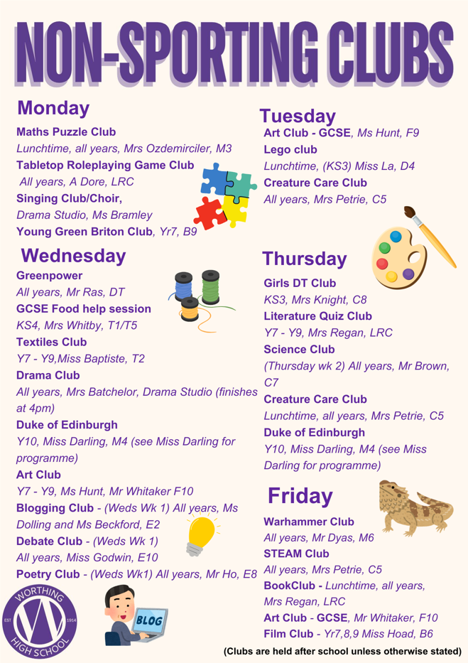 Most clubs will run 3:15pm - 4:15 pm; some clubs run at slightly different times. Please check the club timetable carefully. All students are welcome to attend clubs. Registers will be taken weekly. Therefore, there is no need to sign up for a club before it starts. If students are attending clubs, please can we remind you that students must be in their Worthing High School PE kit.