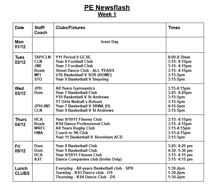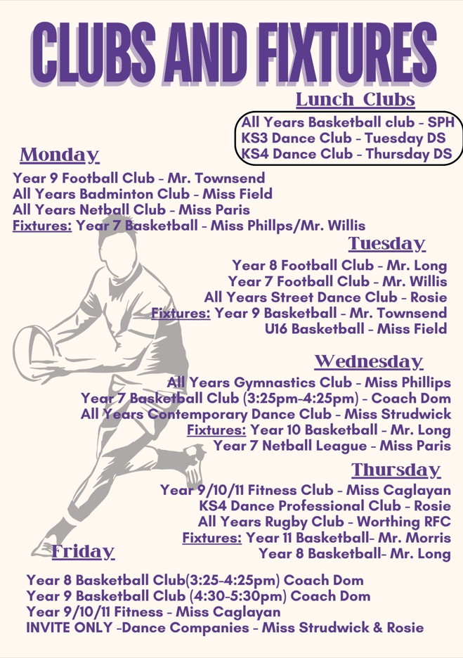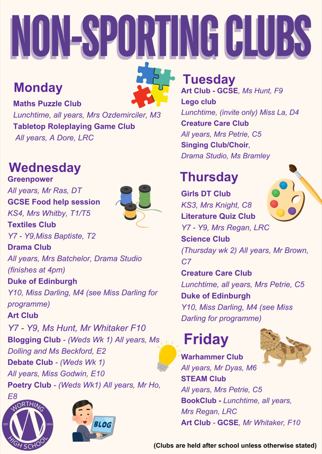 Most clubs will run 3:15-4:15 pm; some clubs run at slightly different times. Please check the club timetable carefully. All students are welcome to attend clubs. Registers will be taken weekly. Therefore, there is no need to sign up for a club before it starts. If students are attending clubs, please can we remind you that students must be in their WHS PE kit.