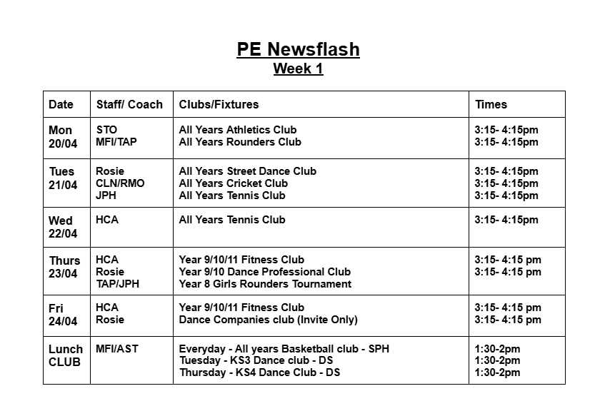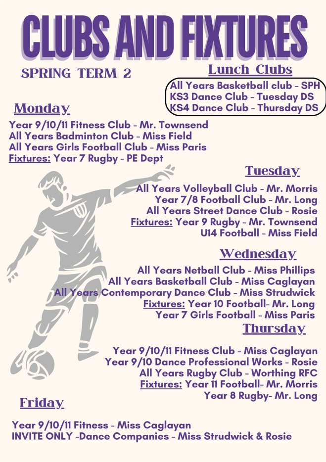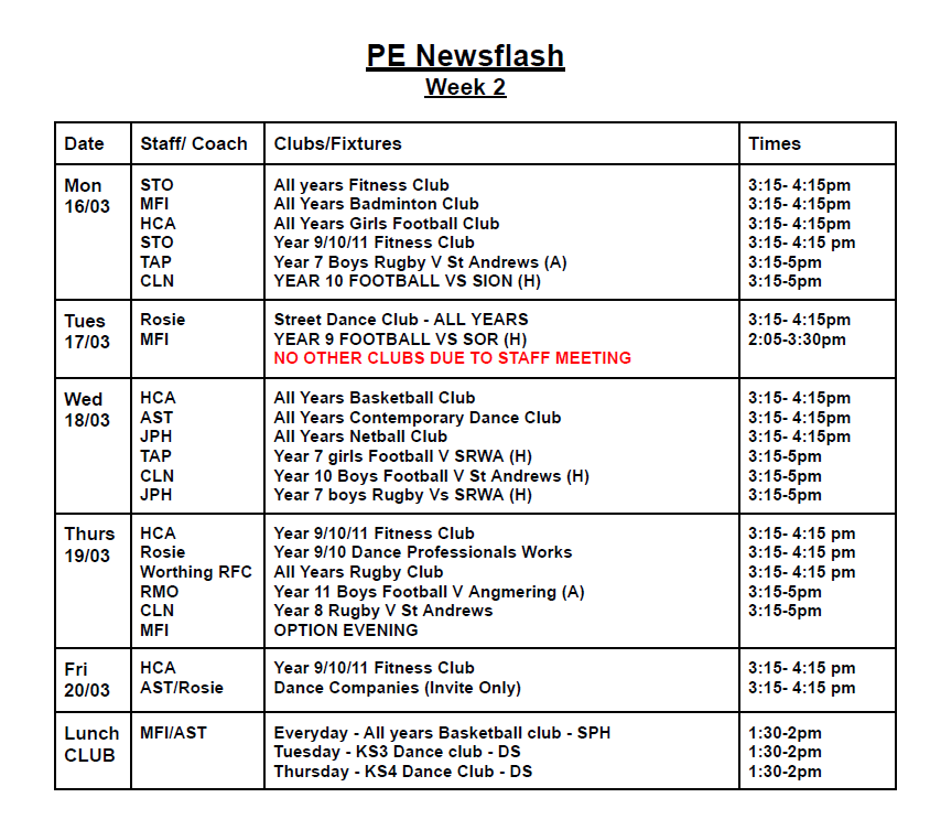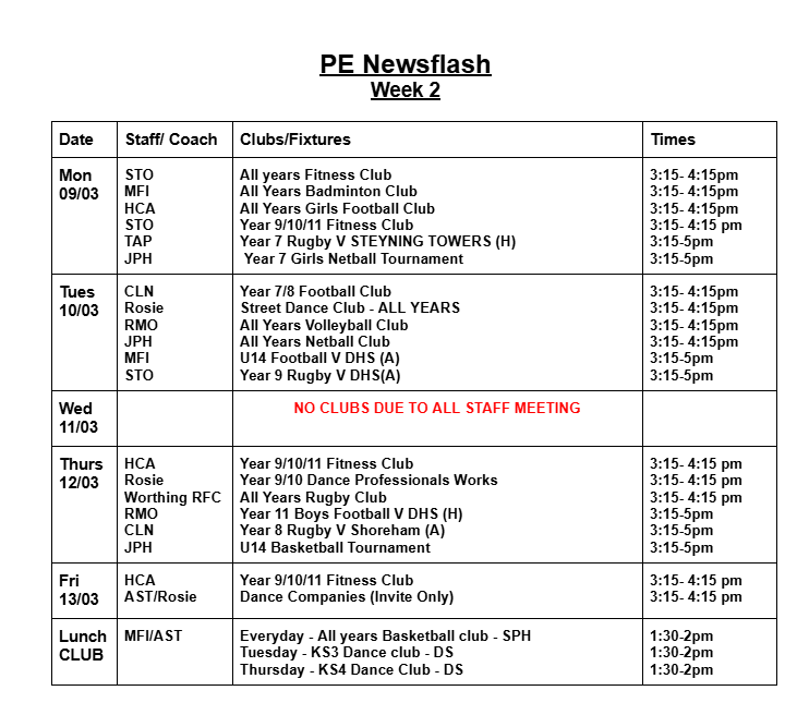 Most clubs will run 3:15pm - 4:15 pm; some clubs run at slightly different times. Please check the club timetable carefully. All students are welcome to attend clubs. Registers will be taken weekly. Therefore, there is no need to sign up for a club before it starts. If students are attending clubs, please can we remind you that students must be in their Worthing High School PE kit.