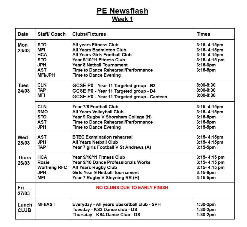 Most clubs will run 3:15pm - 4:15 pm; some clubs run at slightly different times. Please check the club timetable carefully. All students are welcome to attend clubs. Registers will be taken weekly. Therefore, there is no need to sign up for a club before it starts. If students are attending clubs, please can we remind you that students must be in their Worthing High School PE kit.