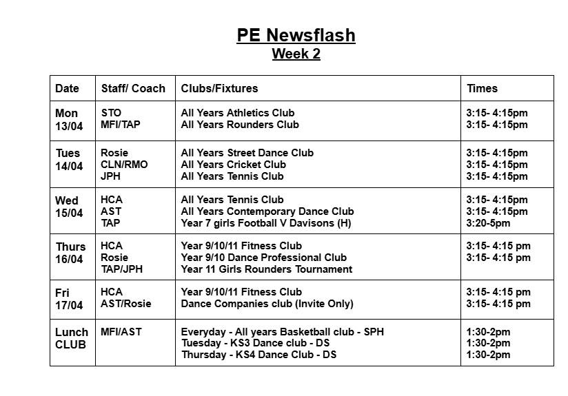 Most clubs will run 3:15pm - 4:15 pm; some clubs run at slightly different times. Please check the club timetable carefully. All students are welcome to attend clubs. Registers will be taken weekly. Therefore, there is no need to sign up for a club before it starts. If students are attending clubs, please can we remind you that students must be in their Worthing High School PE kit.