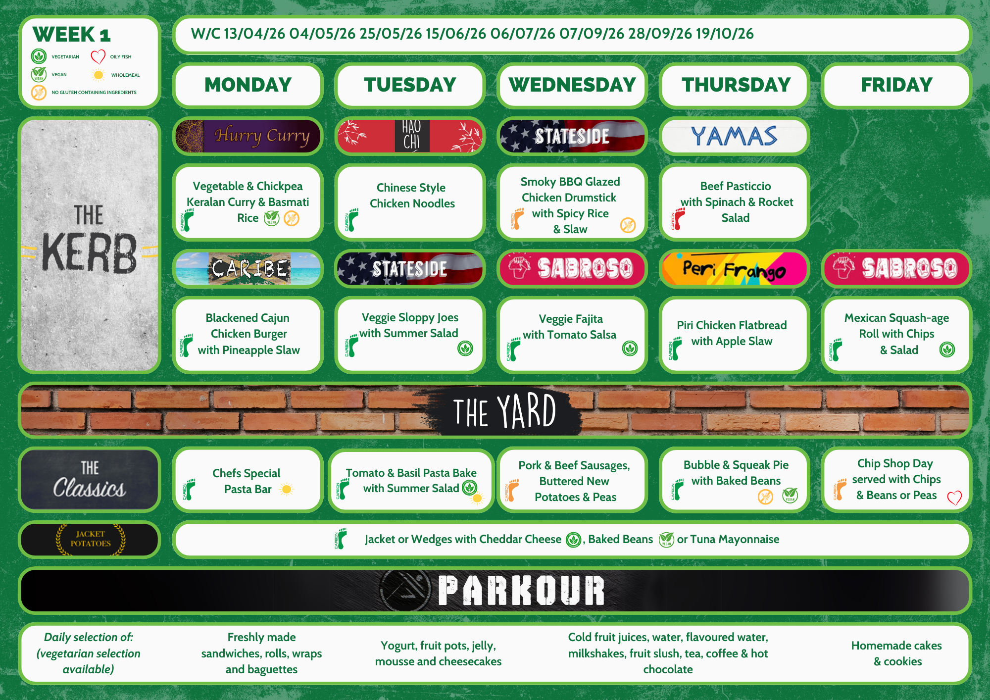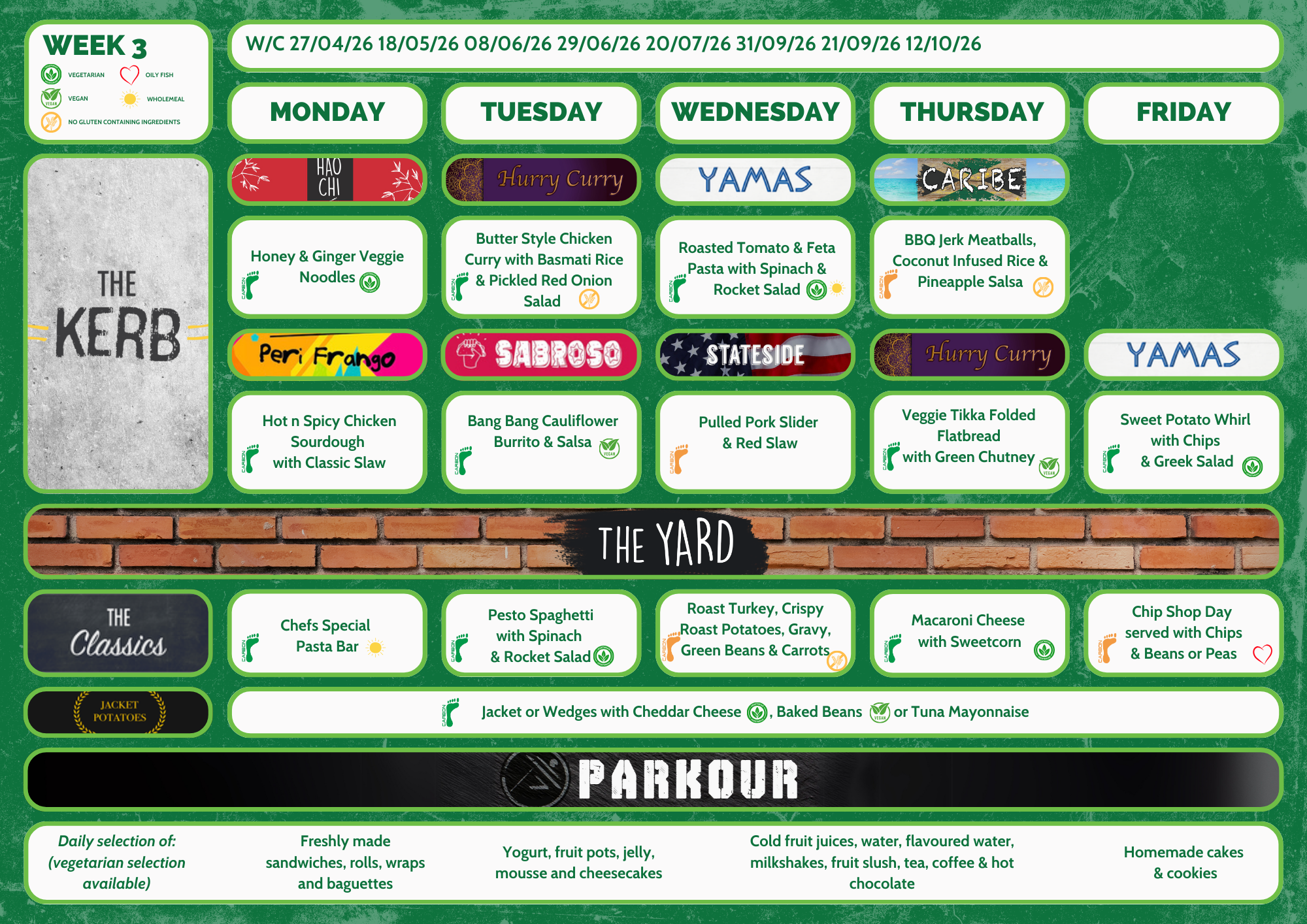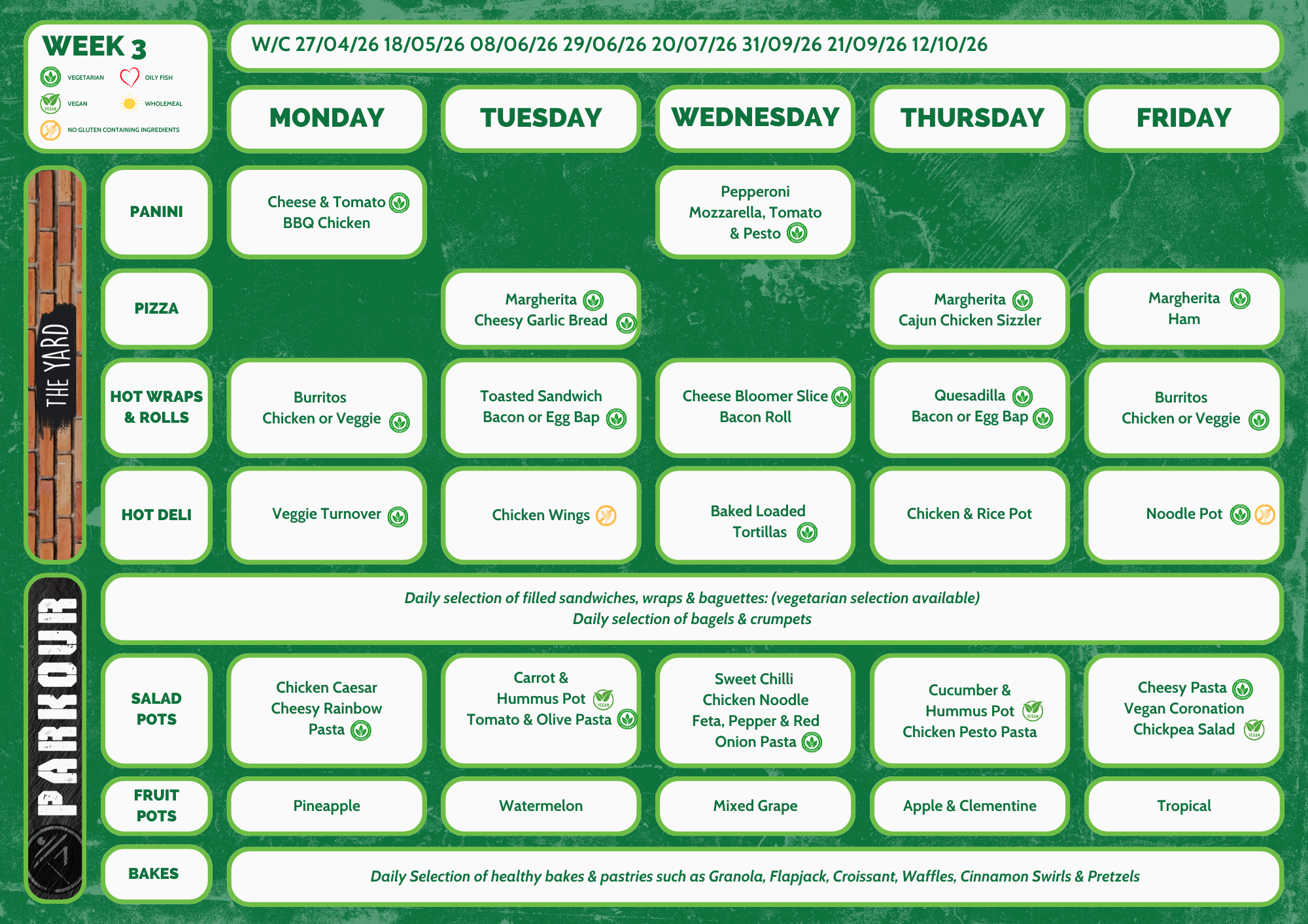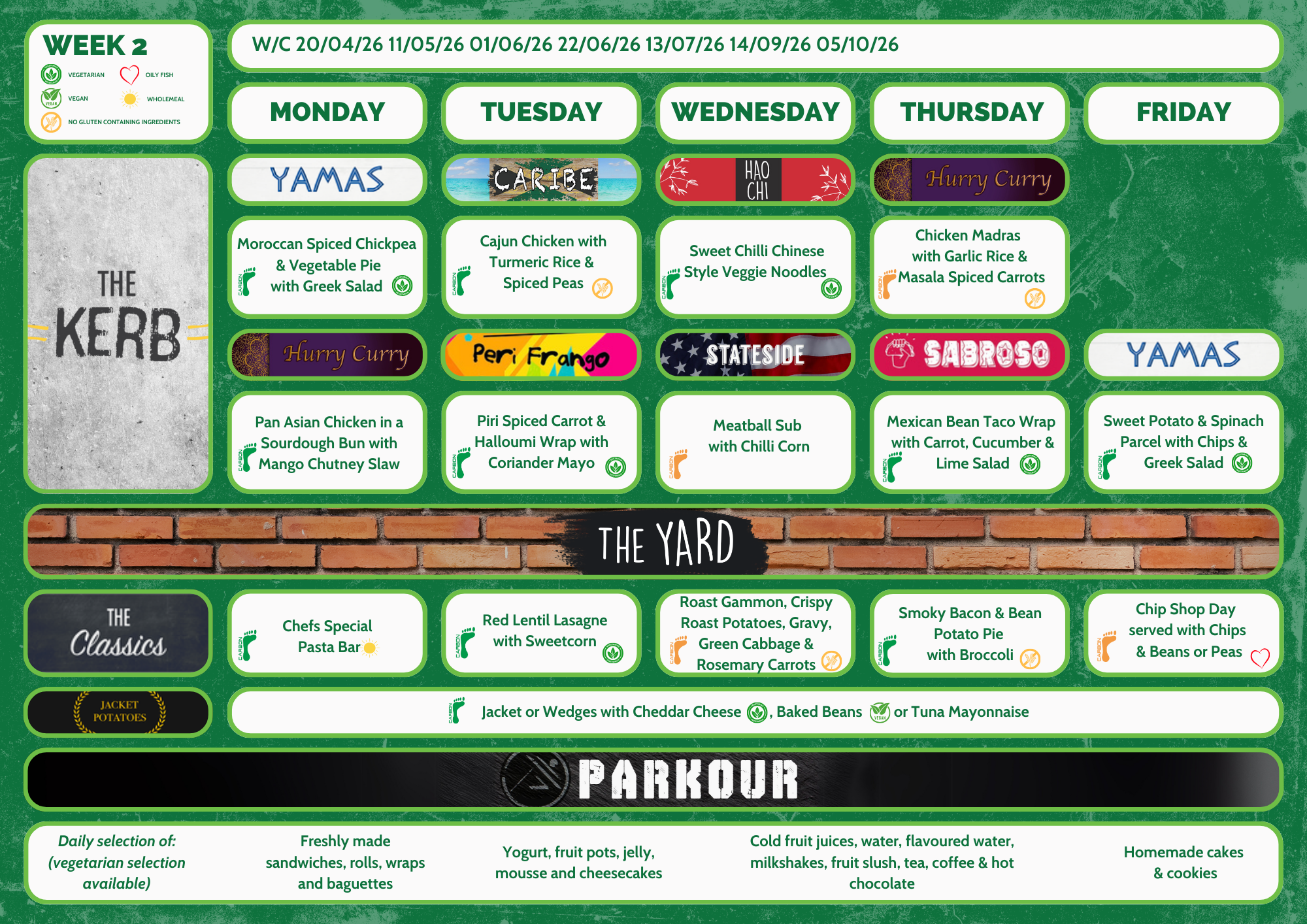 Your daily menus include two food offers from around the world, as well as classic dishes, a variety of jacket potato fillings and a variety of cold grab and go items including salads, wraps, baguettes, sandwiches and dessert items.